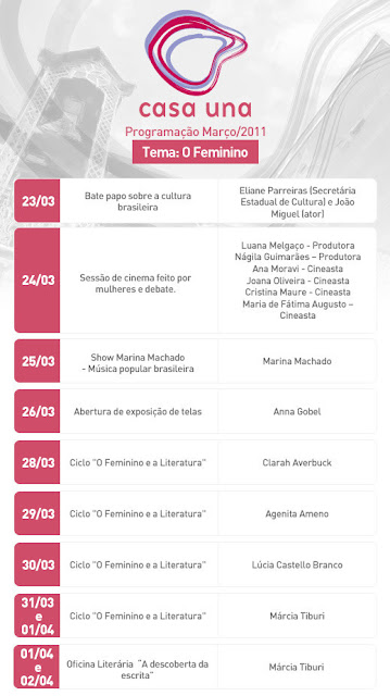 No mês de abertura palestras, seminários, debates, mostras, oficinas e shows, terão como tema central “O Feminino - A criação artística sob a perspectiva feminina”, em homenagem ao mês da mulher.